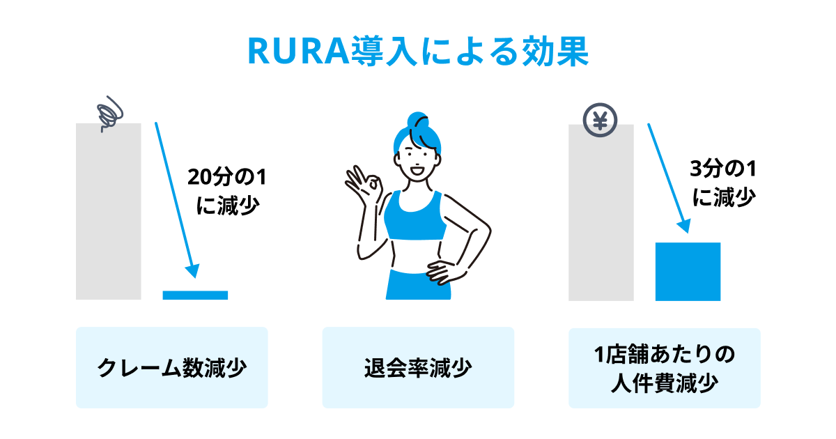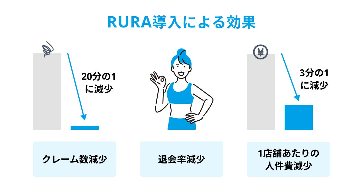 RURAを用いて熟練スタッフにお客様の対応を集約したことにより、人手不足の解消だけでなく、全国の店舗に対して高水準の接客を提供できるようになりました。この結果、RURA導入前と比較して、クレーム数が20分の1に減少、退会率も減少した上、1店舗あたりの人件費が3分の1になるという効果が確認できました。