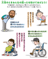 外国の方やお年寄りの方など災害時にさまざまな配慮を必要とする人たちがいます。プログラムを通じて思いやりの気持ちをもった“思いやり防災”を学ぶことができます。