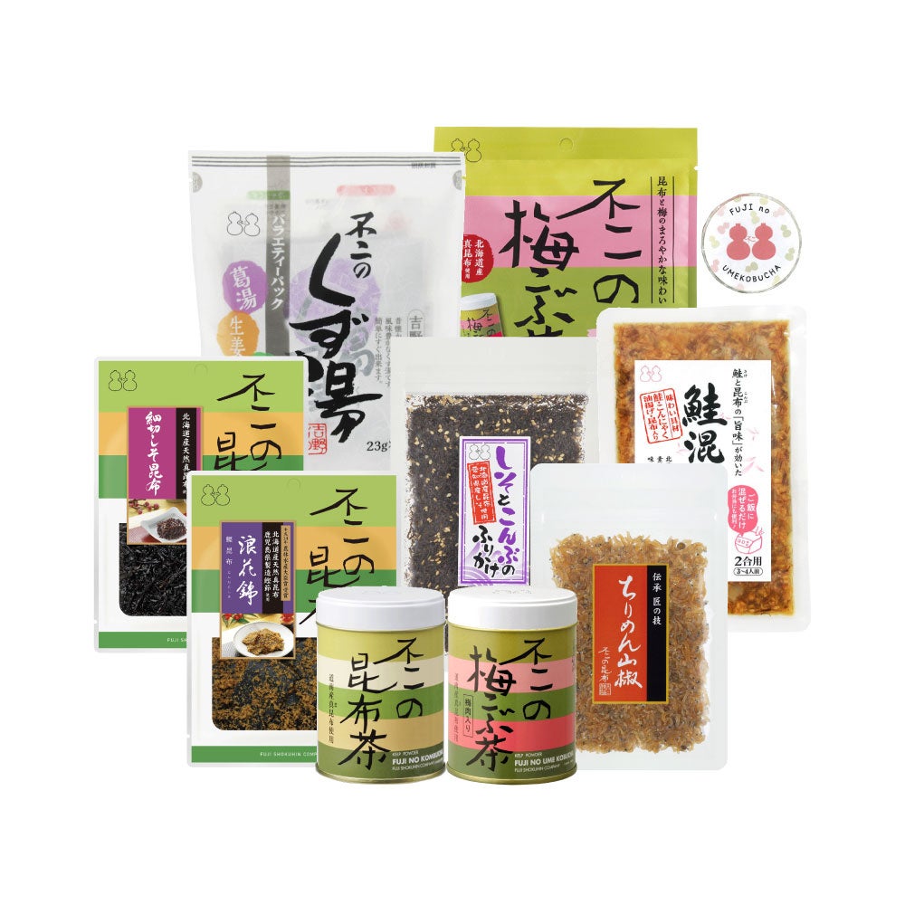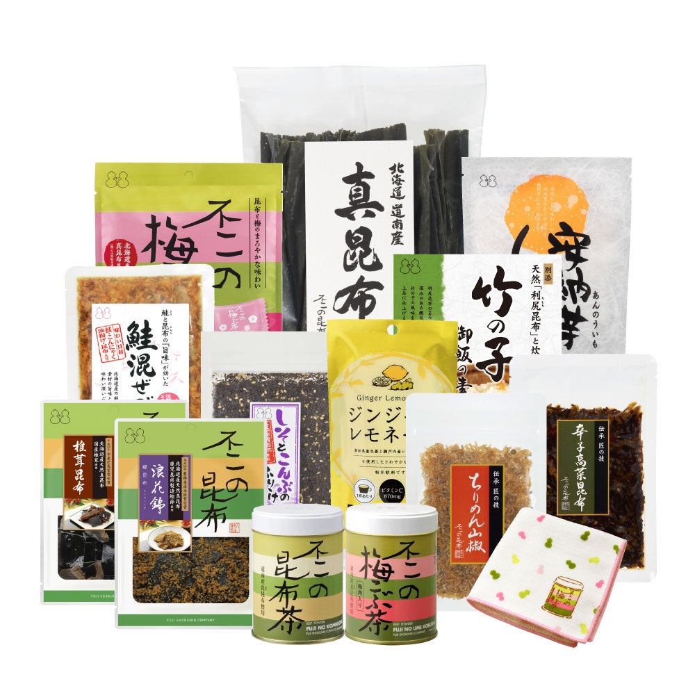 ロングセラーの「昆布茶」「梅こぶ茶」をはじめ、北海道産真昆布を炊き上げた「昆布佃煮」、甘辛い味付けが人気の「ちりめん山椒」、ご飯に良く合う「しそとこんぶのふりかけ」、炊き立てご飯に混ぜるだけの「鮭混ぜご飯」、別添の天然利尻昆布と炊くこだわりの「竹の子御飯の素」、大容量のだし昆布「道南産真昆布」、スティックタイプで飲みやすい「ジンジャーレモネード」、心も体も温まる「安納芋くず湯」、不二の梅こぶ茶を再現した「梅こぶ茶飴」、不二の梅こぶ茶缶をデザインした「ハンドタオル」などバラエティ豊かな全14品+オリジナルレシピブック付き!(昆布茶・梅こぶ茶簡単レシピ18品掲載)