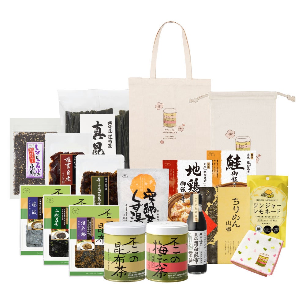 ロングセラーの「昆布茶」「梅こぶ茶」をはじめ、北海道産真昆布を炊き上げた「昆布佃煮」、甘辛い味付けが人気の「ちりめん山椒」、肉厚にカットした椎茸を甘口に仕上げた「椎茸旨煮」、ご飯に良く合う「しそとこんぶのふりかけ」、別添の天然昆布と炊くこだわりの「鮭御飯の素」「地鶏御飯の素」、大容量のだし昆布「道南産真昆布」、三年熟成させた醤油に昆布を漬け込んだ「天然羅臼昆布醤油」、スティックタイプで飲みやすい「ジンジャーレモネード」、心も体も温まる「安納芋くず湯」、不二の梅こぶ茶缶をデザインした「ハンドタオル」「ミニ巾着」「エコバッグ」などボリューム満点全18品+オリジナルレシピブック付き!(昆布茶・梅こぶ茶簡単レシピ18品掲載)