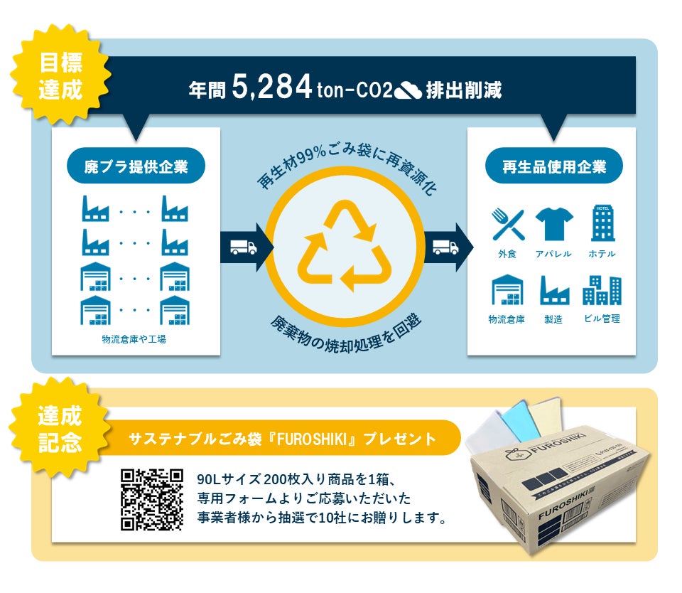 2024年6月、この度の目標達成を記念しまして、本プロジェクトで提供する再生品、再生材ごみ袋『FUROSHIKI』を抽選で10社へお贈りします。このプレゼント企画により、320kgのCO2排出削減に繋がります。既に参加中の方、参加を検討中の方、皆さま奮ってご応募ください。(下記参照)