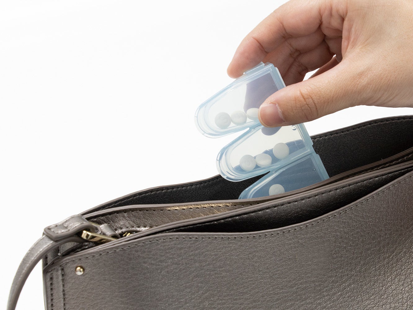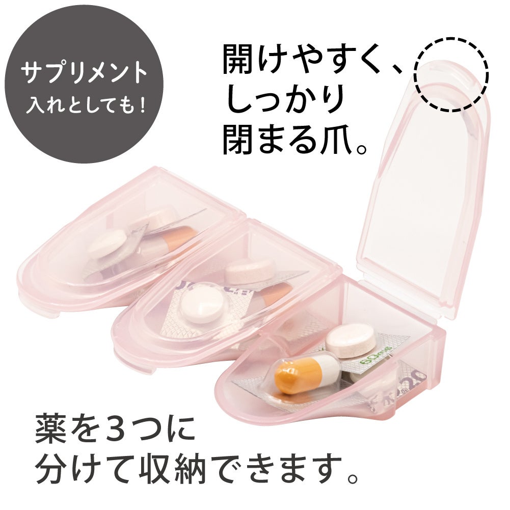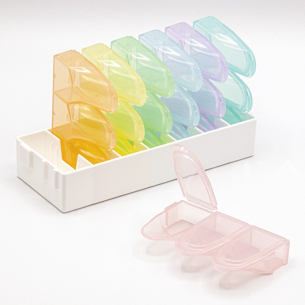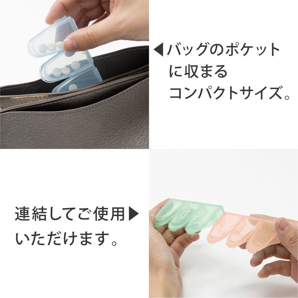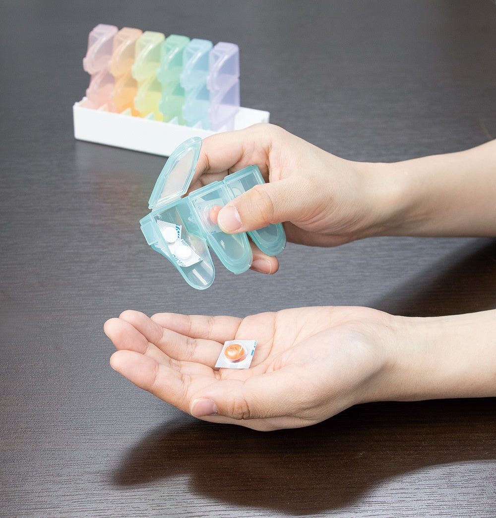 「出しやすい習慣薬箱」は、1日に飲む分だけを携帯できるピルケースです。朝・昼・晩とつに分かれ、飲みたい分だけ簡単に取り出せます。飲み忘れを防ぎます。