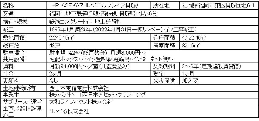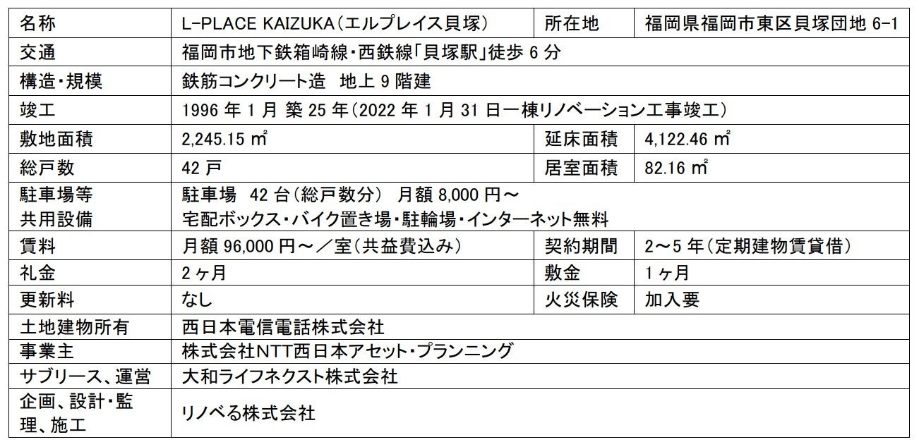 大和ハウスグループの大和ライフネクスト株式会社(本社:東京都港区、代表取締役社長:石﨑順子、以下 大和ライフネクスト)と、テクノロジーを活用したリノベーション・プラットフォームを構築するリノべる株式会社(本社:東京都港区、代表取締役:山下 智弘、以下 リノべる)は、株式会社NTT西日本アセット・プランニング(以下、NTT西日本アセット・プランニング)が事業運用する福岡県福岡市・箱崎エリア貝塚地区にあるNTT西日本の旧社宅を一棟リノベーションし、1月31日に「L-PLACE KAIZUKA(エルプレイス貝塚)」として竣工しました。