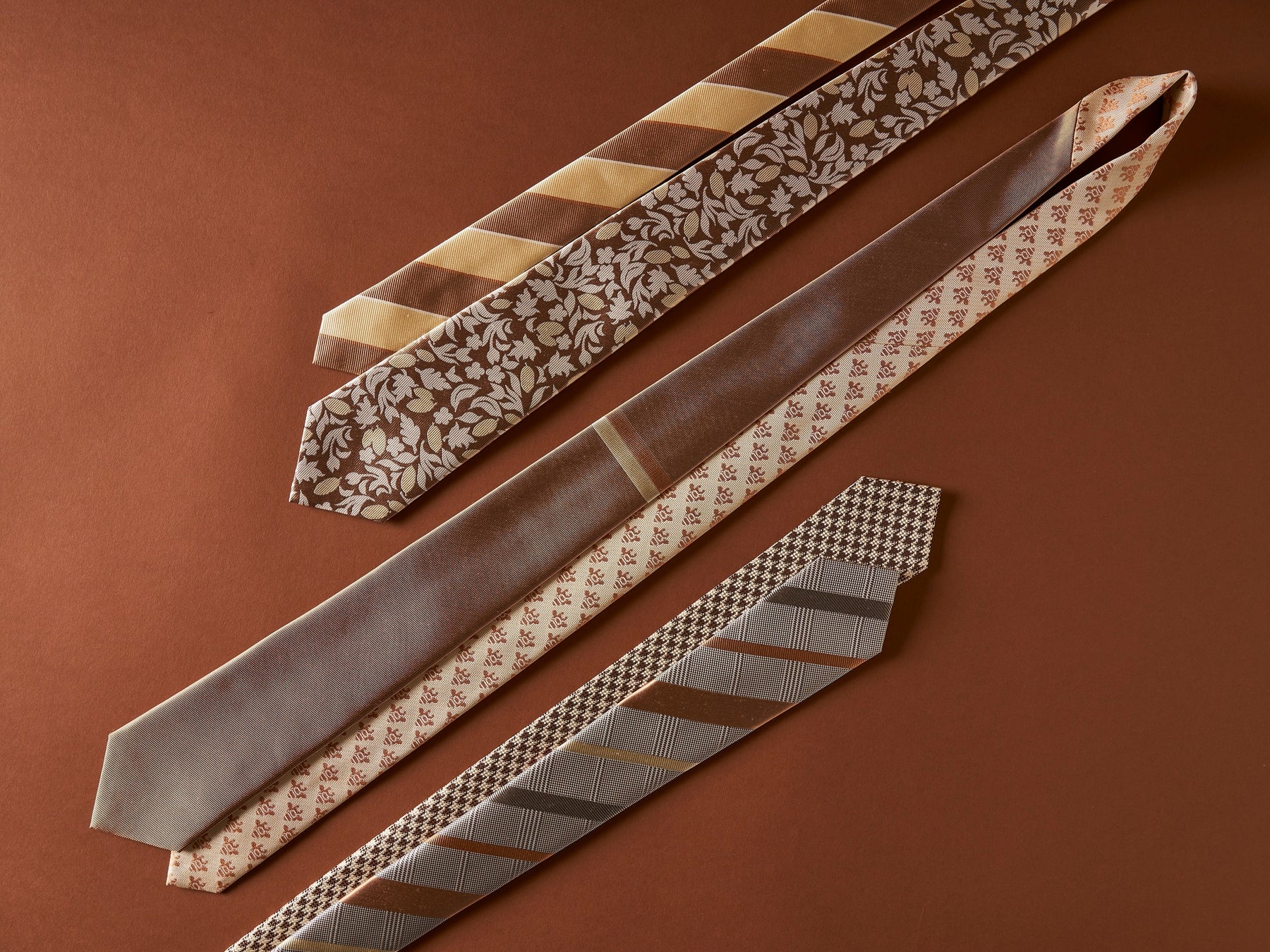 CACAO TIEシリーズは、レジメンタルと千鳥柄のリバーシブルタイ、結び目の少し下に2本ラインがポイントになるトラベルベルトタイ、カカオの絵柄が入ったボタニカル柄のタイという3種類のデザインをご用意。