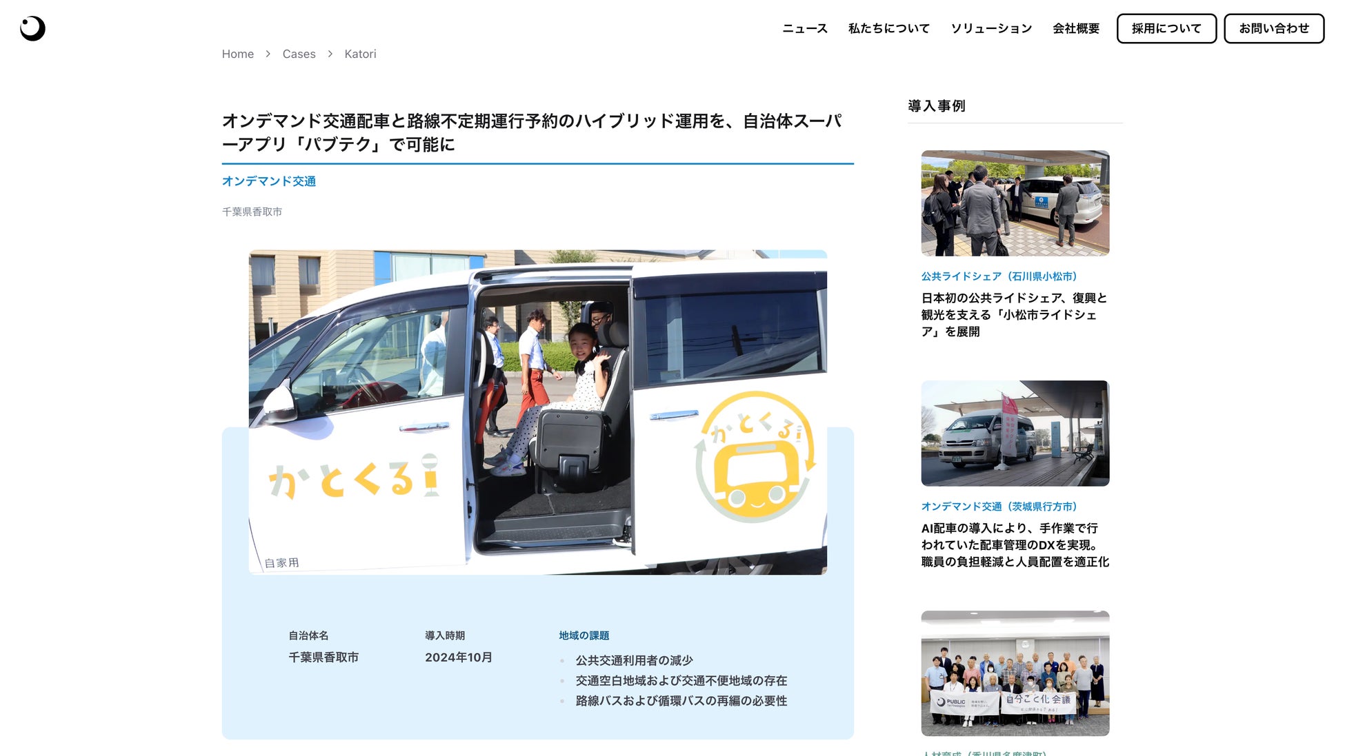 地方自治体に特化したスーパーアプリ「パブテク」や公共ライドシェア、AIを活用した行政支援ツール「パブテクAI行政」など、日本の可能性を最大化するソリューションを提案・実装します。