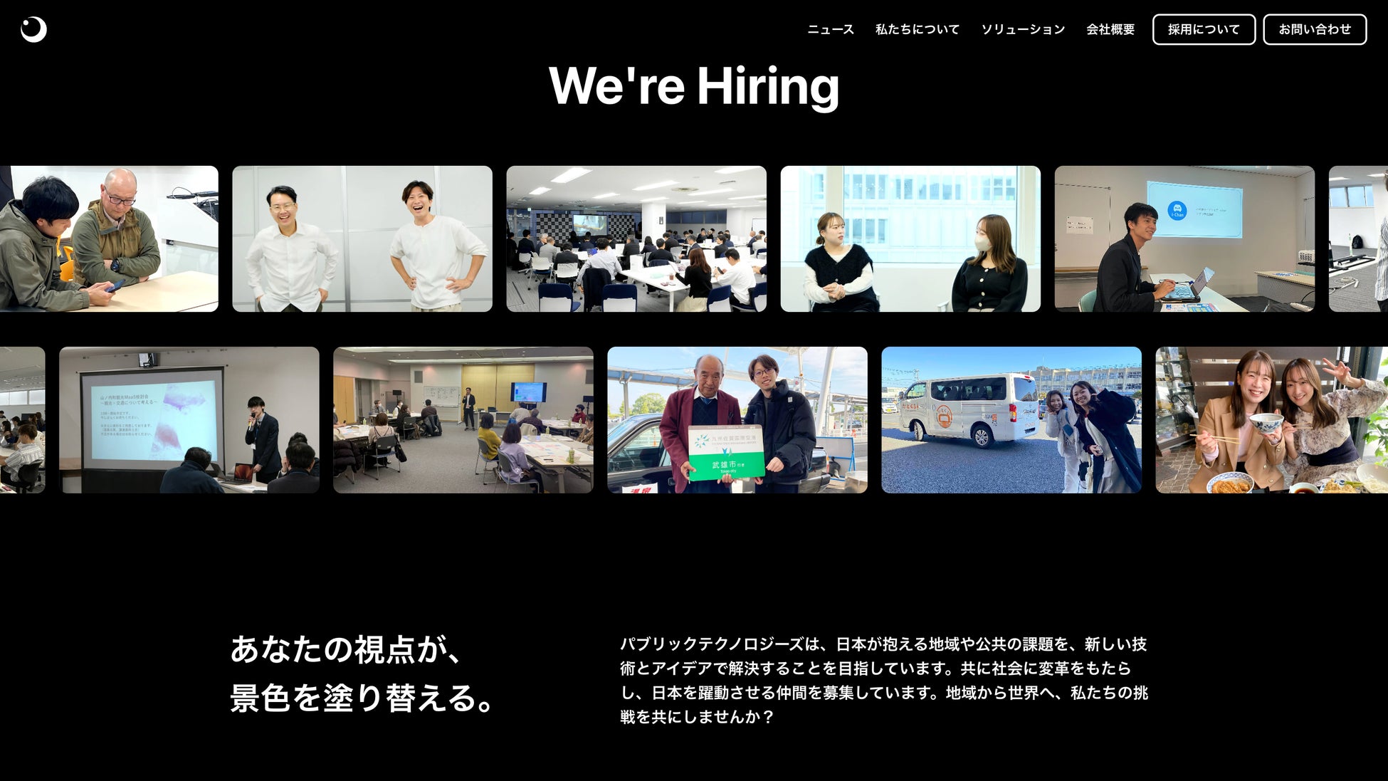パブリックテクノロジーズは「Japanese Dynamism」をビジョンに掲げ、地域の日常から日本全体まで、テクノロジーで日本を躍動させることを目指すGovTech企業です。