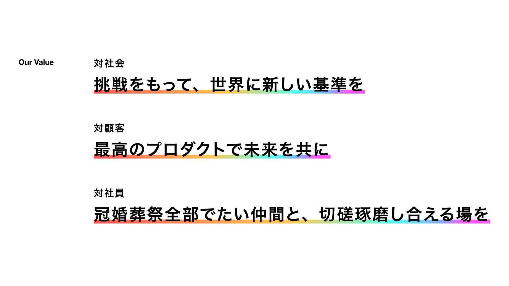 対社会:挑戦をもって、世界に新しい基準を 対顧客:最高のプロダクトで未来を共に 対社員:冠婚葬祭全部でたい仲間と、切磋琢磨し合える場を |