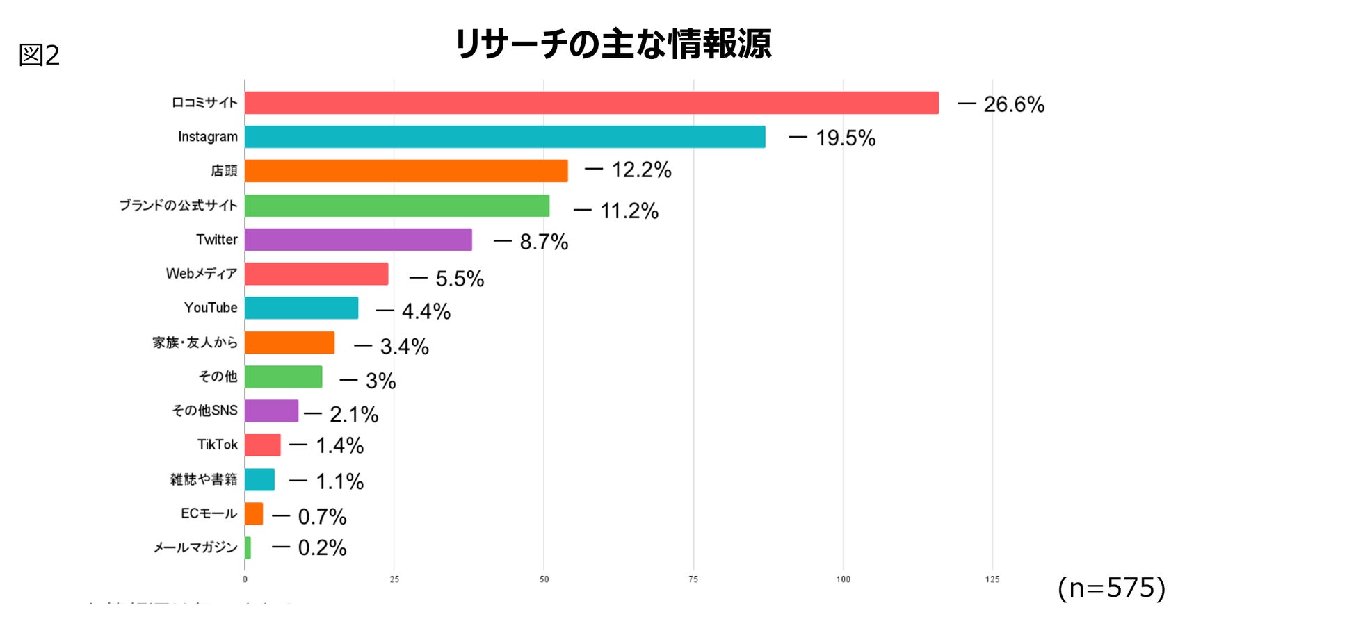 また、3・4位に挙げられた「店頭」「ブランドの公式サイト」は、正確な情報の入手といった観点で重視されていると思われ 、他者の評価・公式の情報を両方入手し、検討していると思われます(図2) 。