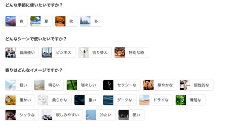 香りを表す際に、一般的に言われる香りタイプだけでなく、香りからイメージする色やファッション、心象表現など香りの「感じ方」に 寄与する感性的な要素を独自で定義しています。これにより、嗅覚、視覚などのマルチモーダルな情報を扱うことができるようになり、香りの総合的な印象からより好みの香りを選べるようになりました。