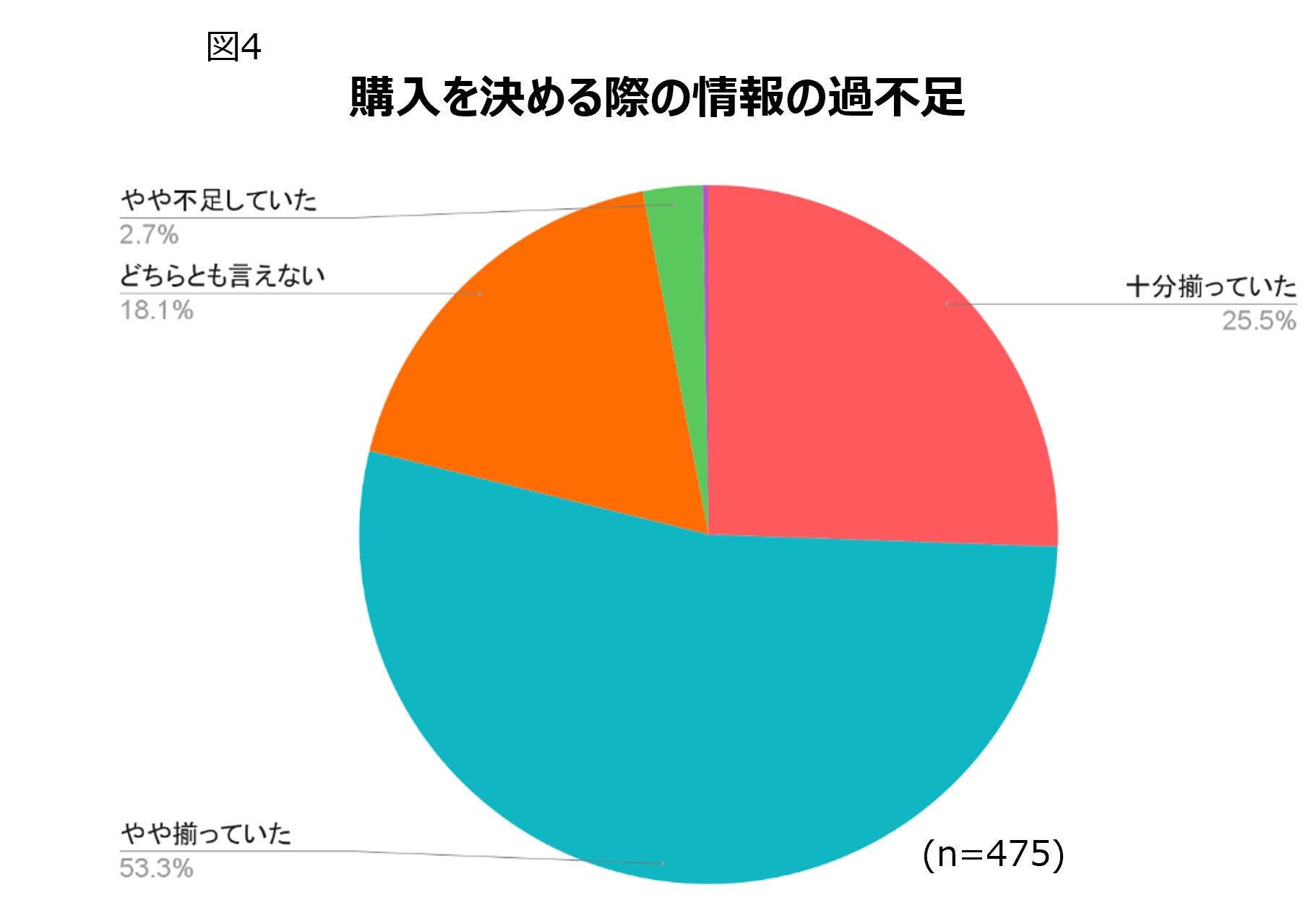 一方、購入を決める際の情報について十分情報が揃っていたかを伺ったところ、「十分に揃っていた/やや揃っていた」という方が合わせて77.5%でした(図4)。