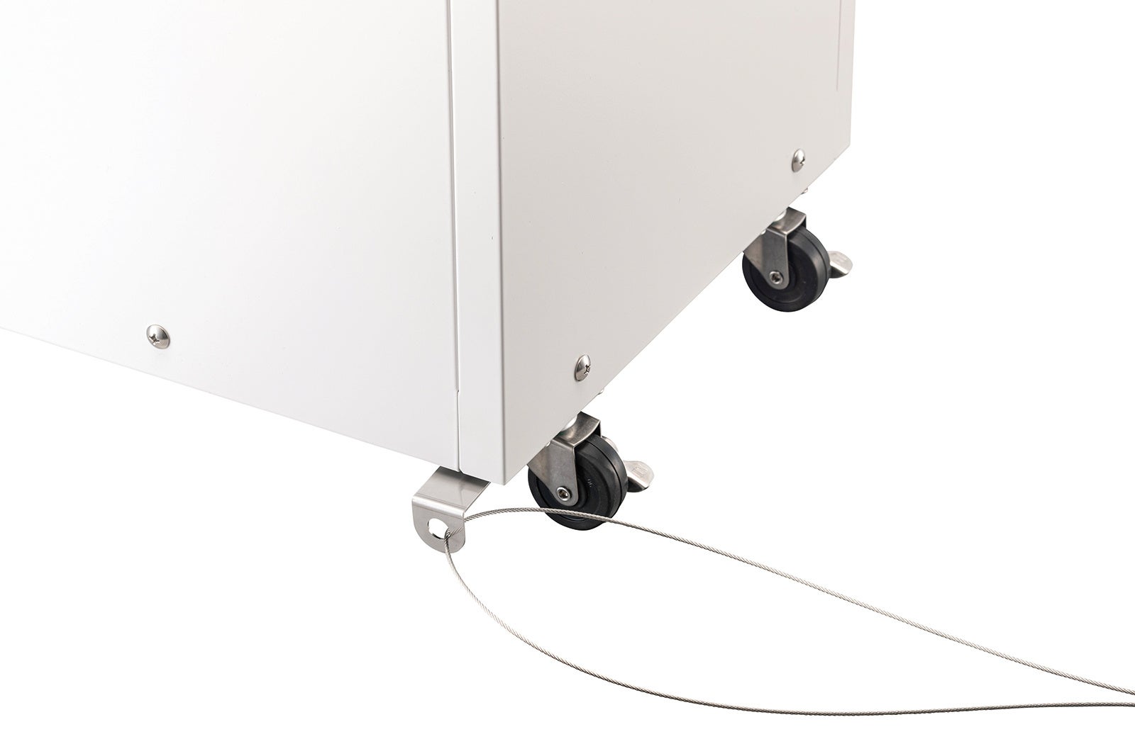 建物等とワイヤー固定が可能。アンカー固定と併用することで防犯性を向上します。(写真はキャスターセットと併用した場合)