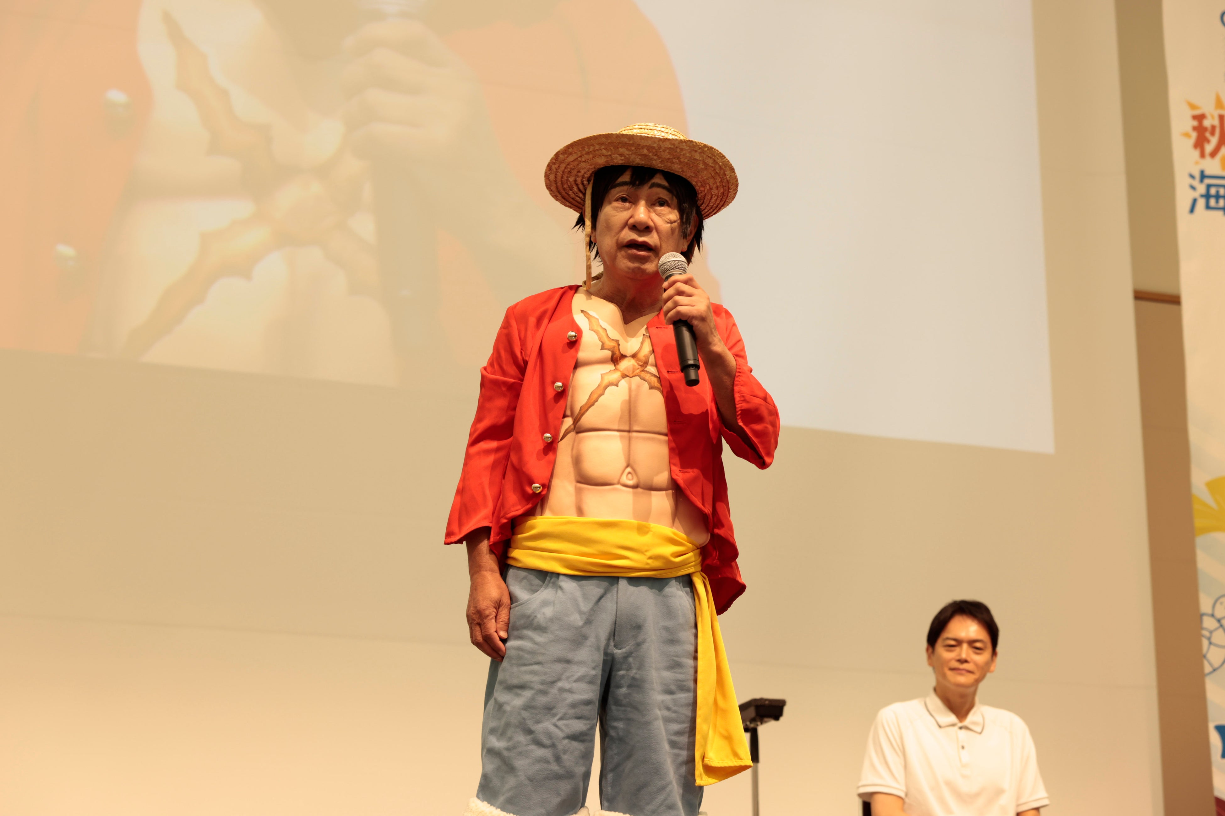 「海ごみゼロウィーク」主催者として日本財団会長 笹川陽平氏、環境省 環境副大臣 滝沢求氏、後援として、横浜市長 山中竹春氏が登壇。笹川氏は「ONE PIECE(ワンピース)」主人公の「モンキー・D・ルフィ」のコスプレをして登壇し、会場を盛り上げました。それぞれの代表者から、「海洋ごみを減らすためにまずは陸地のごみを清掃しないといけない」という重要性を会場に集まった参加者に呼びかけ、「ごみを拾って、海を守ろう!」の掛け声で清掃活動がスタートしました。