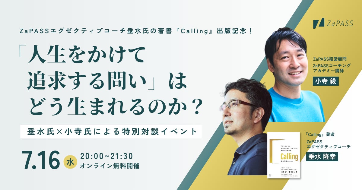 本イベントは、『Calling』著者の垂水氏と、ZaPASS経営顧問・ZaPASSコーチングアカデミー講師であり、長年経営と人材開発に携わる小寺氏による対談形式で実施します。
