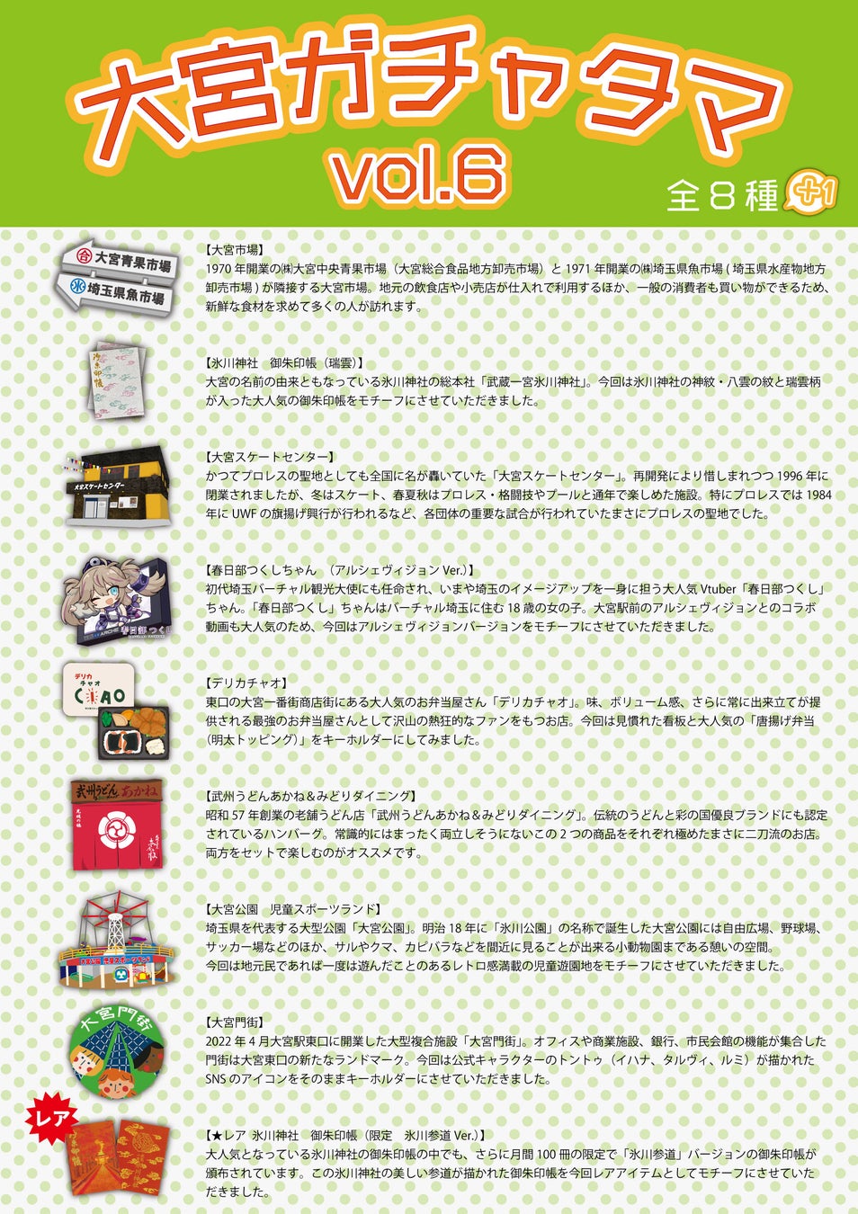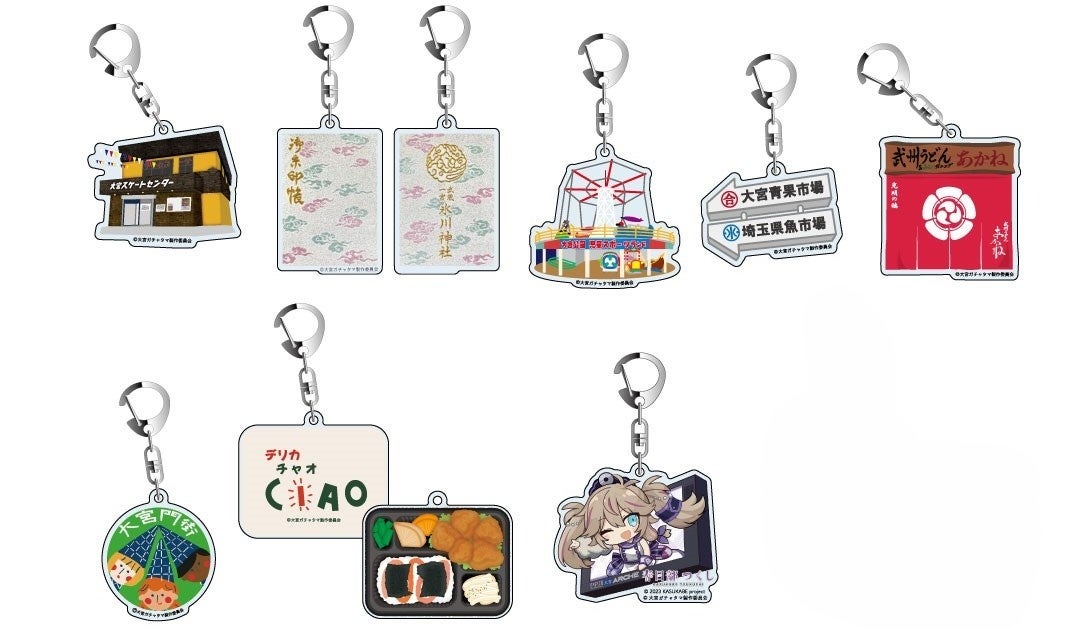 今回は、大宮地域の食を支える「大宮市場」、氷川神社で大人気の「御朱印帳」、かつてプロレスの聖地としても全国的に名が轟いていた「大宮スケートセンター」、大人気Vtuber「春日部つくしちゃん」と「アルシェヴィジョン」のコラボアイテム。大宮芸人さんをはじめ熱烈なファンをもつお弁当屋さん「デリカチャオ」、絶品のハンバーグも有名な老舗うどん店「武州うどんあかね&みどりダイニング」、地元民の想い出がつまった「大宮公園児童スポーツランド」、大宮東口の新施設「大宮門街」のキャラクター「トントゥ」の全8種。