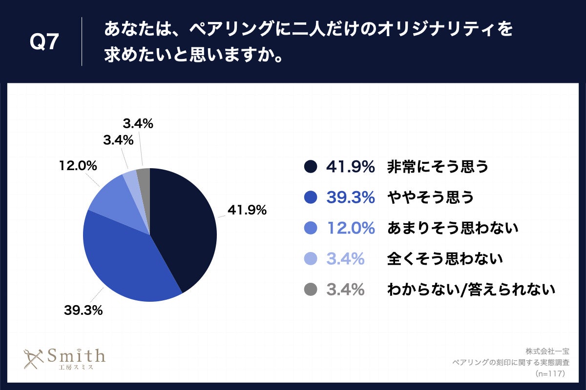 「Q7.あなたは、ペアリングに二人だけのオリジナリティを求めたいと思いますか。」(n=117)と質問したところ、「非常にそう思う」が41.9%、「ややそう思う」が39.3%という回答となりました。