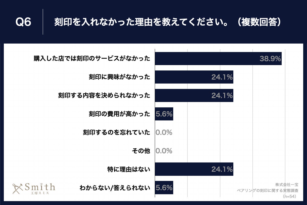 Q2で「いいえ」と回答した方に、「Q6.刻印を入れなかった理由を教えてください。(複数回答)」(n=54)と質問したところ、「購入した店では刻印のサービスがなかった」が38.9%、「刻印に興味がなかった」が24.1%、「刻印する内容を決められなかった」が5.6%という回答となりました。
