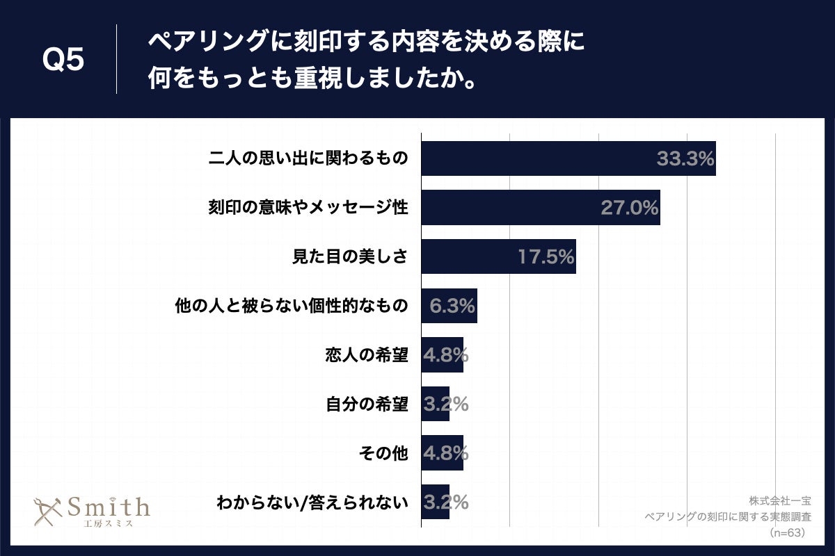 Q2で「はい」と回答した方に、「Q5.ペアリングに刻印する内容を決める際に何をもっとも重視しましたか。」(n=63)と質問したところ、「二人の思い出に関わるもの」が33.3%、「刻印の意味やメッセージ性」が27.0%、「見た目の美しさ」が17.5%という回答となりました。