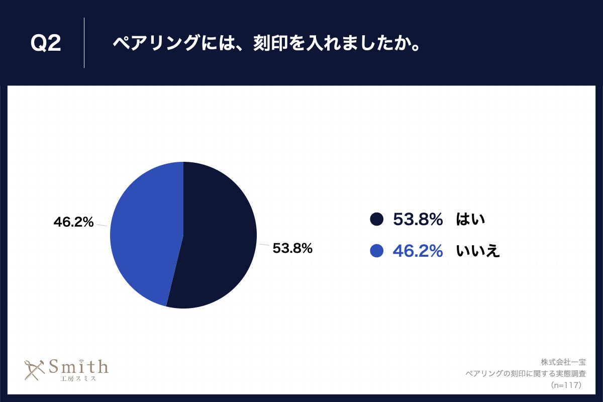 「Q2.ペアリングには、刻印を入れましたか。」(n=117)と質問したところ、「はい」が53.8%という回答となりました。