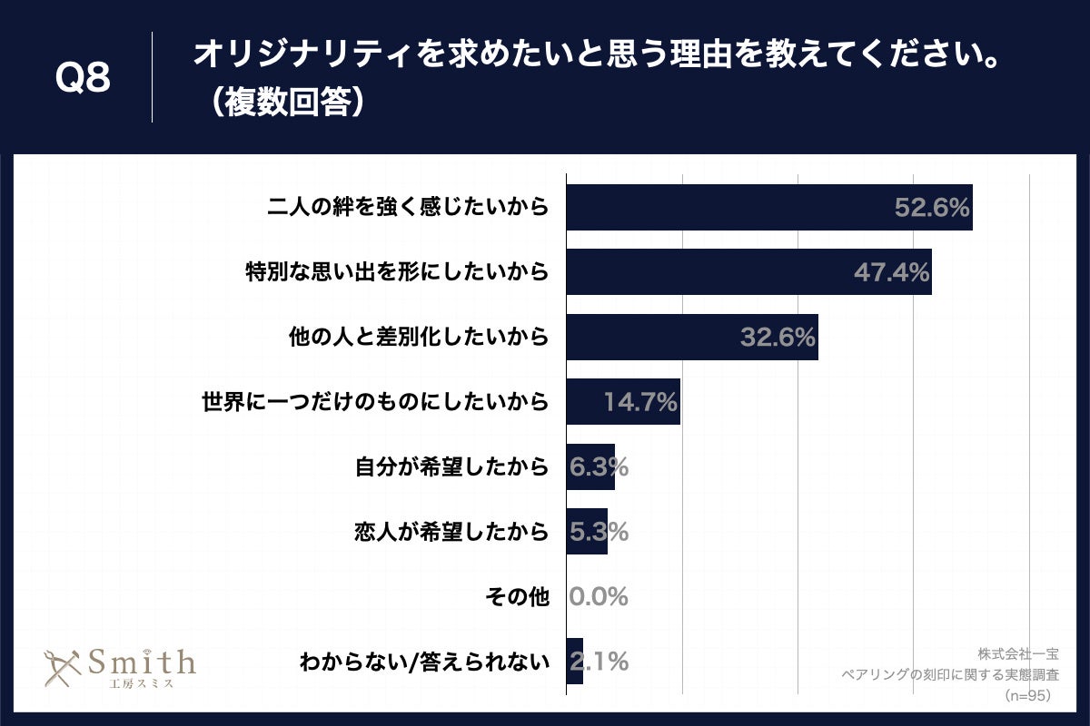 Q7で「非常にそう思う」「ややそう思う」と回答した方に、「Q8.オリジナリティを求めたいと思う理由を教えてください。(複数回答)」(n=95)と質問したところ、「二人の絆を強く感じたいから」が52.6%、「特別な思い出を形にしたいから」が47.4%、「他の人と差別化したいから」が32.6%という回答となりました。
