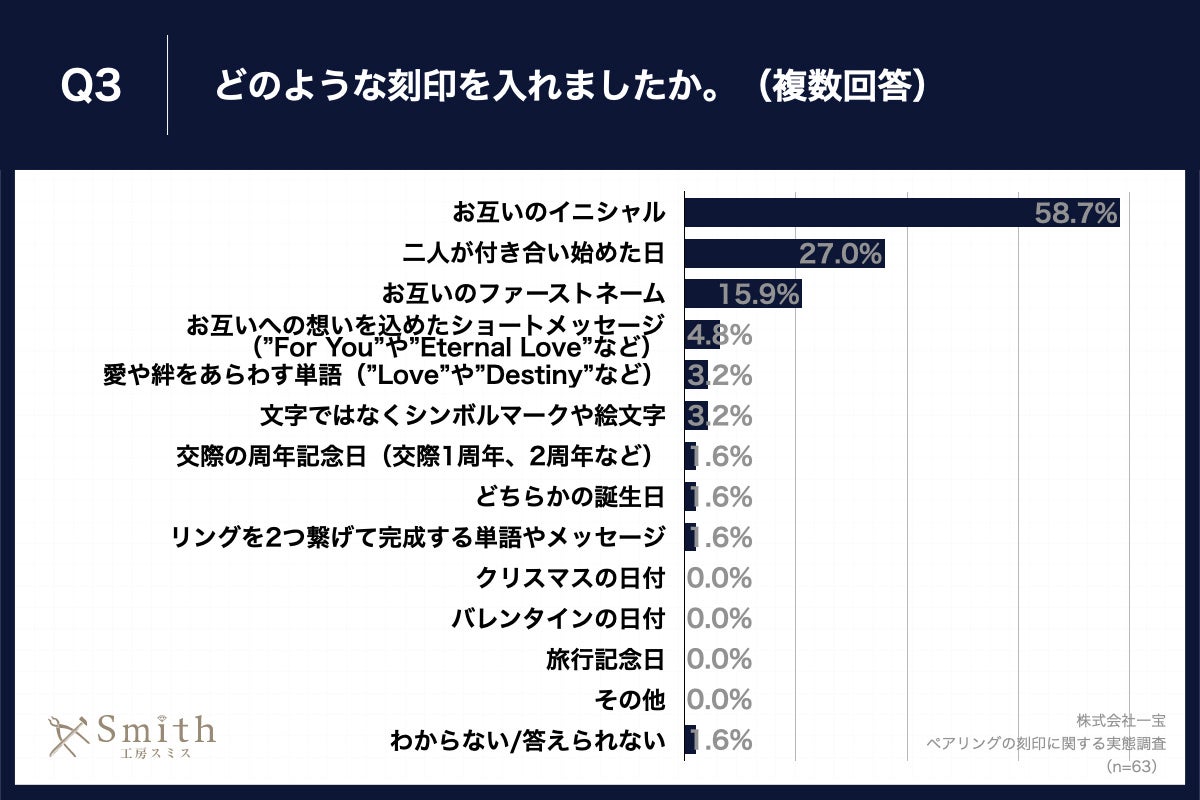 Q2で「はい」と回答した方に、「Q3.どのような刻印を入れましたか。(複数回答)」(n=63)と質問したところ、「お互いのイニシャル」が58.7%、「二人が付き合い始めた日」が27.0%、「お互いのファーストネーム」が15.9%という回答となりました。