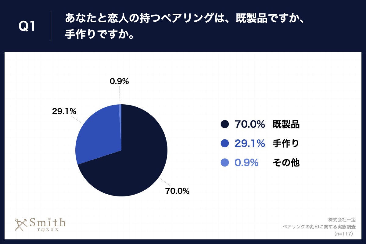 「Q1.あなたと恋人の持つペアリングは、既製品ですか、手作りですか。」(n=117)と質問したところ、「既製品」が70.0%、「手作り」が29.1%という回答となりました。