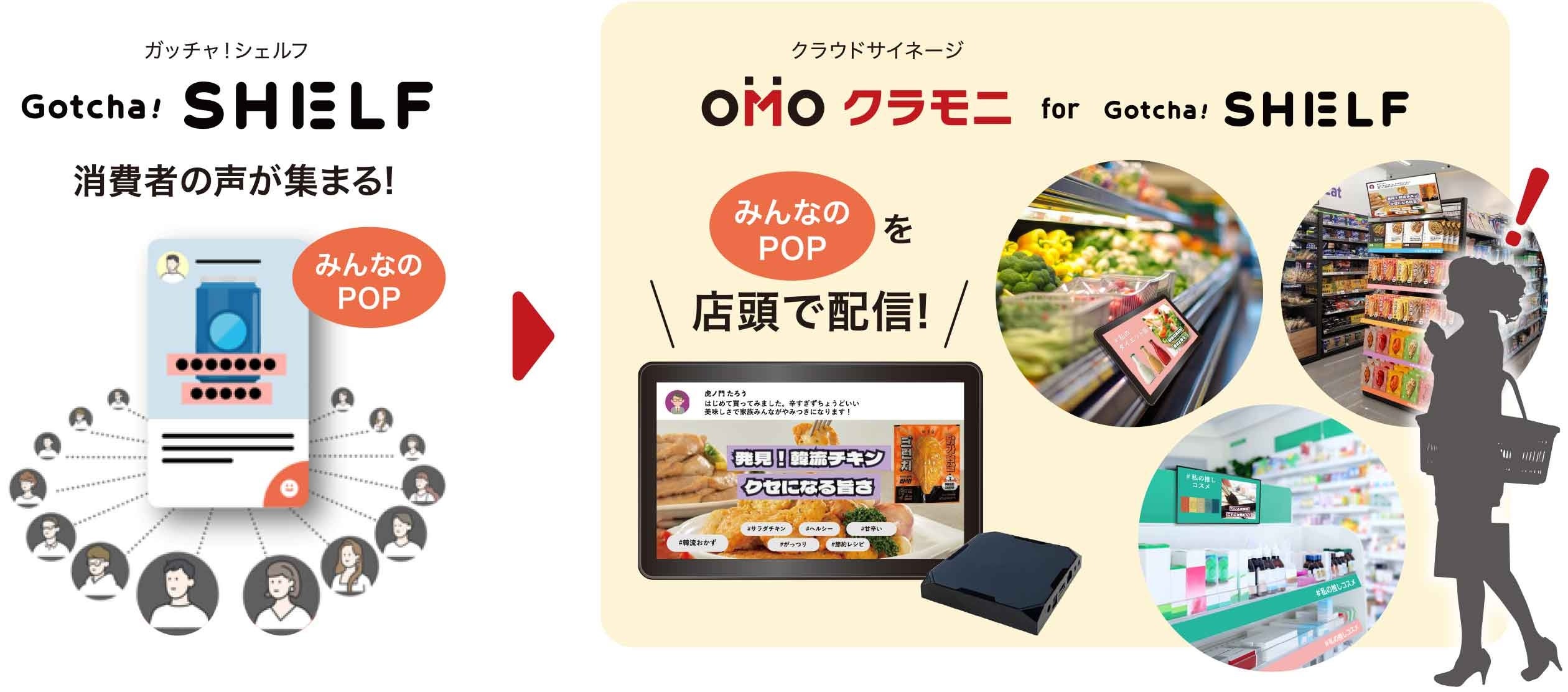 ガッチャ!シェルフで集められた「みんなのポップ」を店頭のサイネージに生成する新しい販促サービスです。お客さまの「声」で商品をおすすめするリテールメディアとして、小売企業様へは新たな収益源に、メーカー企業様にとっては、消費者の声を活用した販促策として活用できます。