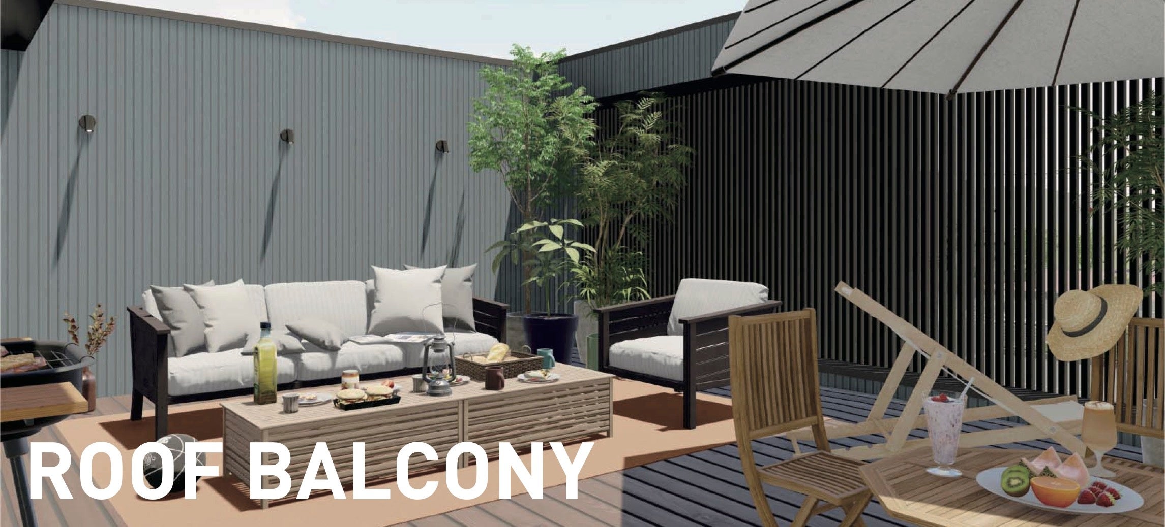 - 最大の特徴は、広いビルトインガレージと、広いルーフバルコニー