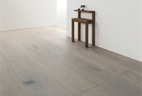 天然木の風合いを大切にし節や割れを生かした床。幅は300mmという広さ。空間を広く見せ、高級感を醸し出します。