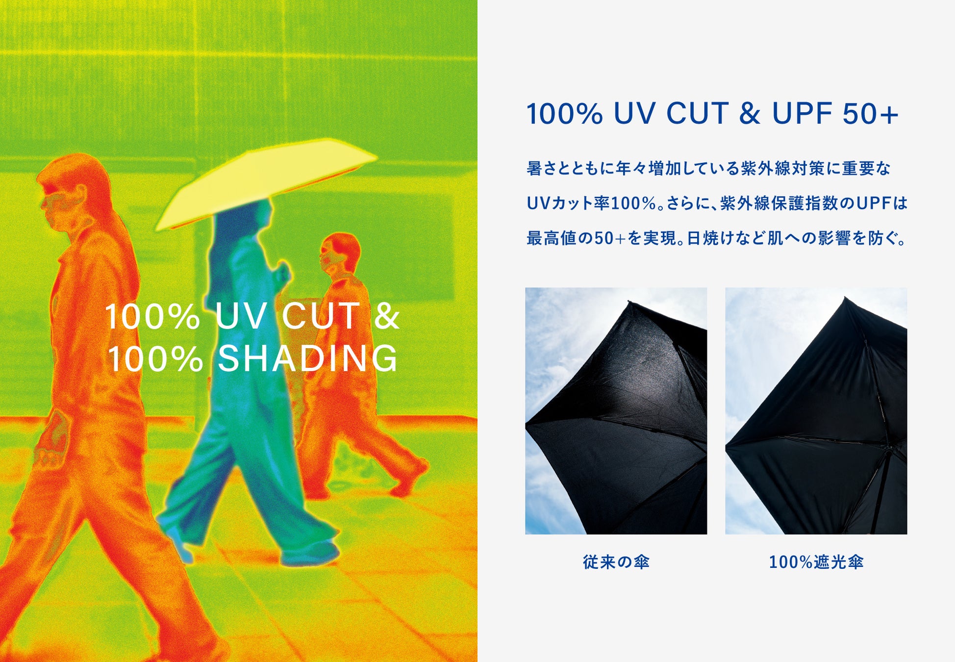 気候変動により増加傾向にある猛暑日にも涼しく快適に過ごせて雨でも使えるように、そして地球にもやさしいようにと、生地はリサイクルペットボトル100%のRE:PET™を採用し完全遮光加工を施しました。
