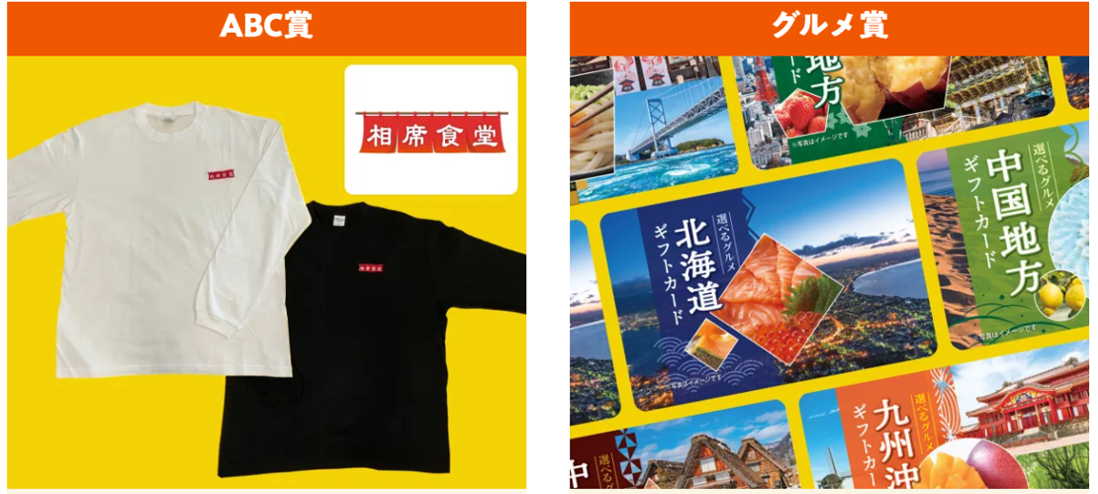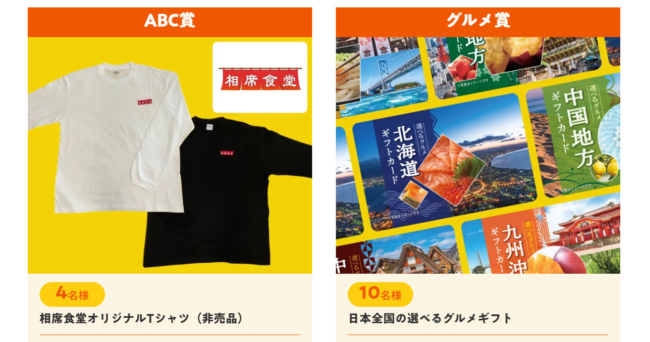 日頃の感謝を込めて、全返礼品への寄付を対象に、寄付金額の12%相当のAmazonギフトカードをプレゼントします。金額上限などの制限はございません。さらに、キャンペーンにご参加いただいた方の中から抽選で「相席食堂」(毎週火曜よる11時17分)のロゴが胸元にプリントされたオリジナルTシャツ(非売品)を4名様に、ご当地グルメギフト(5,500円相当)を10名様にプレゼントいたします。