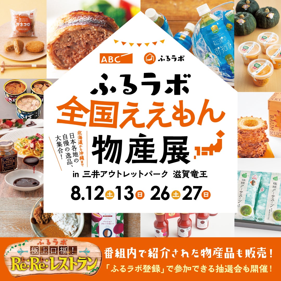 朝日放送テレビpresents「ふるラボ全国”ええもん”物産展in三井アウトレットパーク 滋賀竜王」を計4日間開催!ふるさと納税で人気の、北海道から沖縄まで日本全国の逸品が【滋賀竜王】に大集結します。