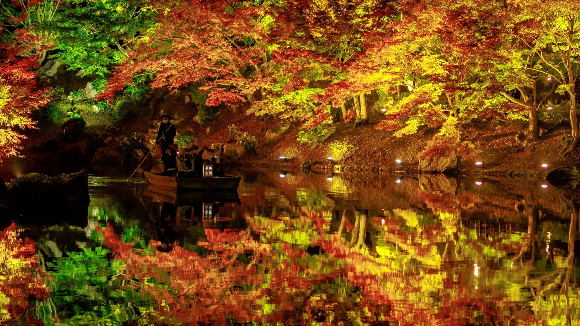 期間中は夜の入園が可能で、赤く色づいた木々がライトアップによって湖面に映る園内は、日中の庭園美とは違った幻想的な空間となります。一番の見どころは約7,890平方メートルに広がる南湖(なんこ)全体を包み込むようにライトアップされた景観です。さらに南湖を和船で周遊できる「南湖周遊和船」からは、湖面から園内の景色を体験でき、地上の散策とはまた別の風情を楽しむことができます。