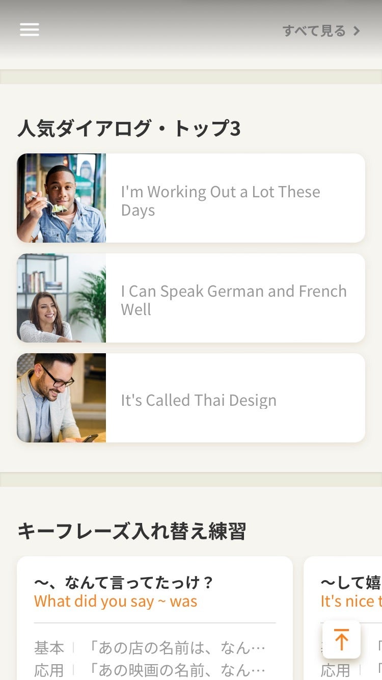 | ・短いシチュエーション毎のダイアログ練習だけでなく、「日常英会話」「ビジネス英会話」の2テーマで、「朝起きてから寝るまで」「クライアントと会い交渉、その後会議でプレゼンをする」というような、実生活に即した会話の流れを練習できる「連続したシーンでの英会話学習」機能を追加 ・ユーザーからの要望の多かった「人気ダイアログ・トップ3」「トピック別表現」等も選択可能に ・ワンタッチで学習開始できる、ユーザーへのおすすめダイアログが表示される等、ユーザビリティを向上 |