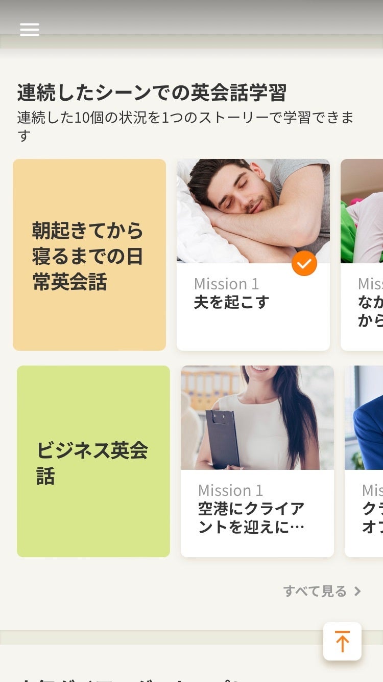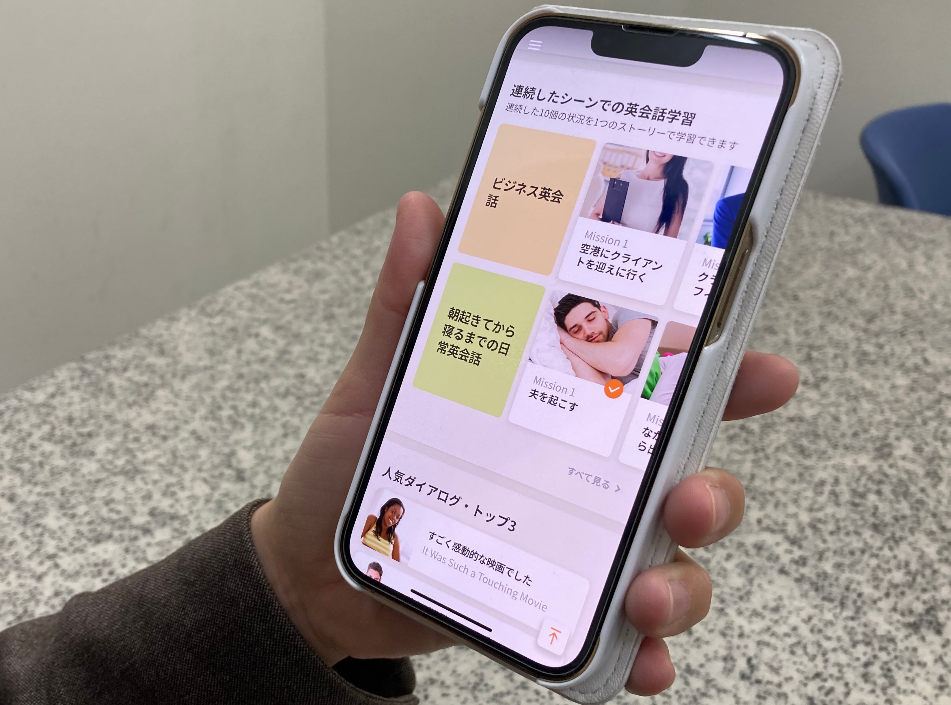 新たに練習できるようになった「連続したシーンでの英会話学習」は、例えば日常英会話では、起床してから夜ベッドに入るまでの10シーンのダイアログを連続して学習することができます。「朝、家族を起こし、自身もオフィスへ出勤。職場で同僚や上司と業務などについて会話をし、退社後に自宅で家族にその日の出来事を話す」という1日の流れを、ユーザー自身が主人公になりきって、一気に学ぶことができます。ビジネス英会話では、クライアントを空港まで迎えに行くシーンや、同僚との会話、契約交渉、オンラインミーティング、プレゼンなどのシーンで使用される表現が練習できるようになっています。その他、人気のダイアログを選び学習することや、興味関心のあるトピックを中心に学習することもできるようになりました。