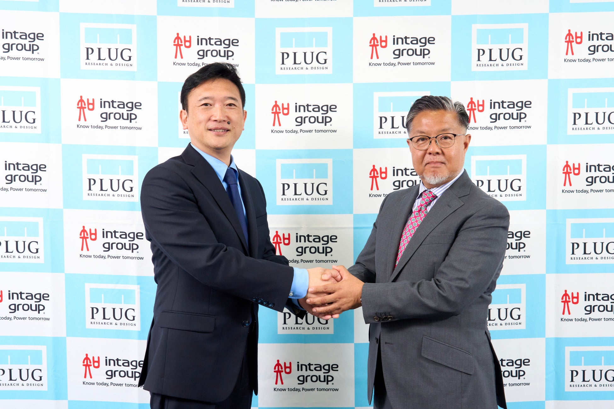 (写真左より)プラグ代表取締役社長・小川亮、インテージHD代表取締役 常務 マーケティング支援(消費財・サービス)海外事業担当・仁司与志矢氏