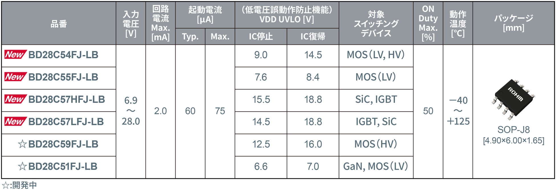 ローム株式会社(本社:京都市)は、産業機器のAC-DC電源に最適なPWM制御方式(*1)FET外付けタイプの汎用コントローラICを開発しました。低耐圧MOSFET駆動用に「BD28C55FJ-LB」、中・高耐圧MOSFET駆動用に「BD28C54FJ-LB」、IGBT駆動用に「BD28C57LFJ-LB」、そしてSiC MOSFET駆動用に「BD28C57HFJ-LB」と、幅広いパワートランジスタに対応可能な4機種から量産を開始しています。