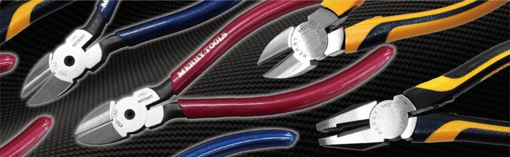 1927 年よりスタートした「MERRY」ハンド工具は一般的なニッパー、ペンチ、ラジオペンチを始めとする手工具で、人の力で作業する工具で個人ユーザーからプロ仕様まで幅広くモノづくりや工事現