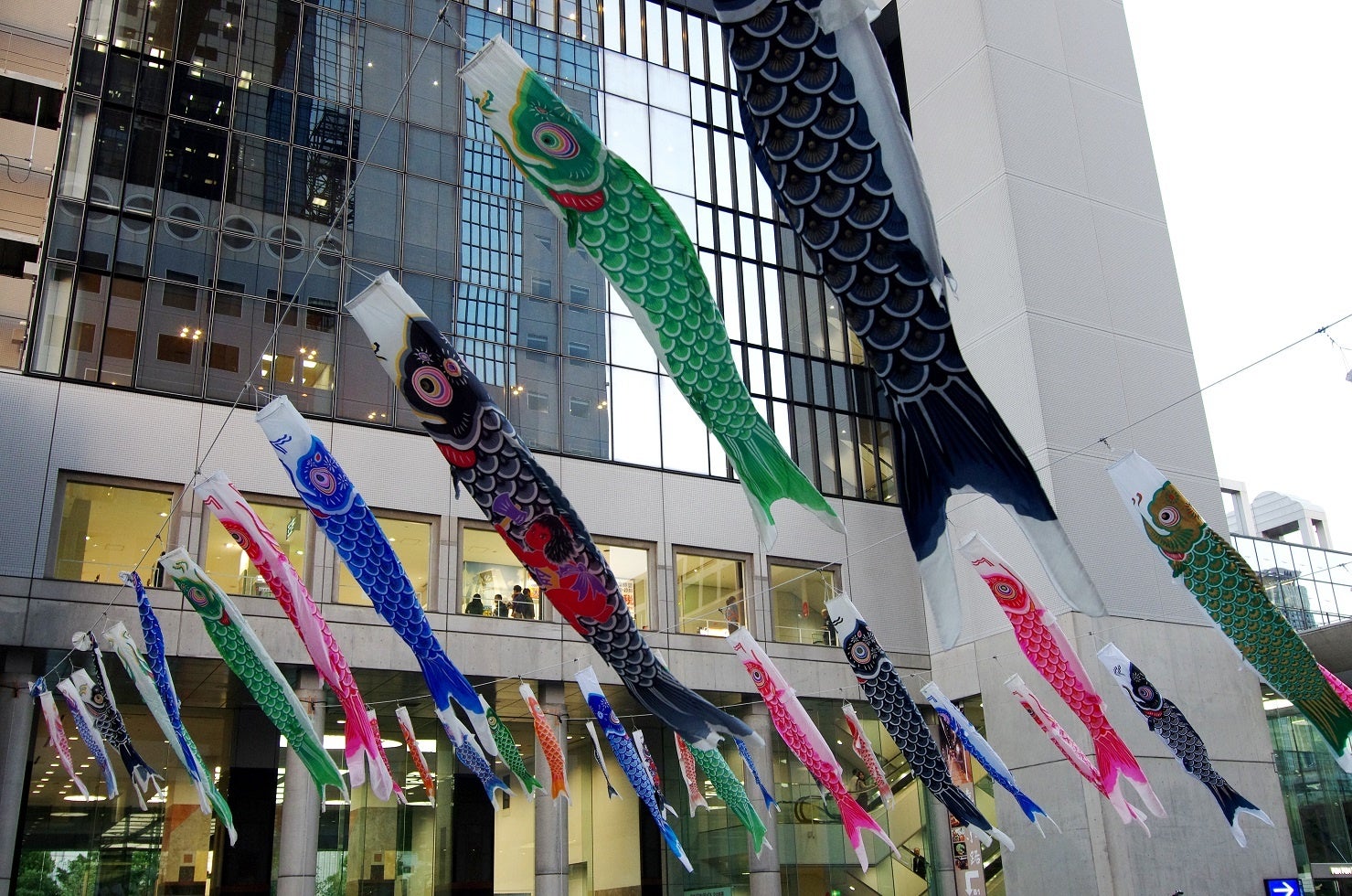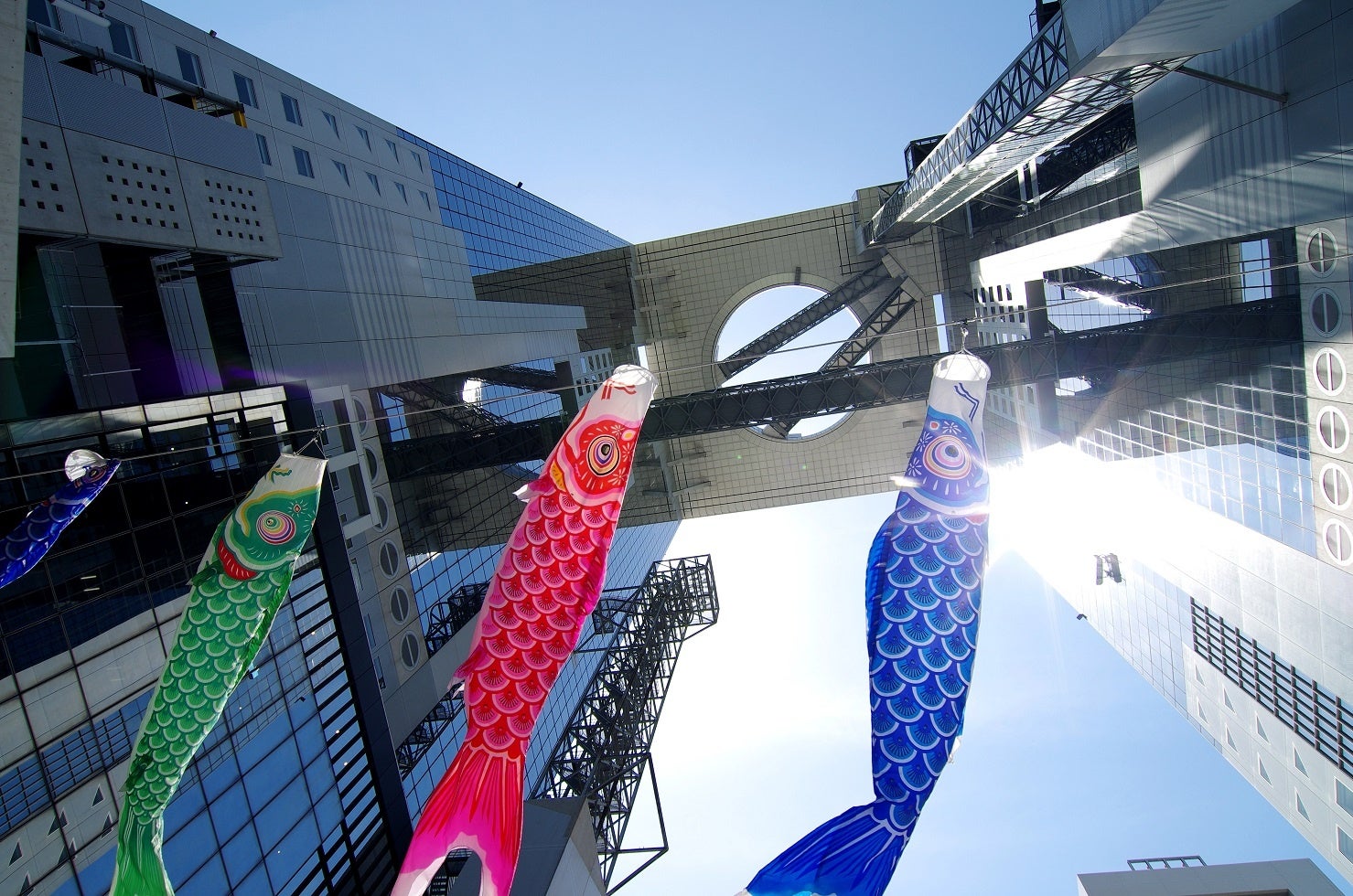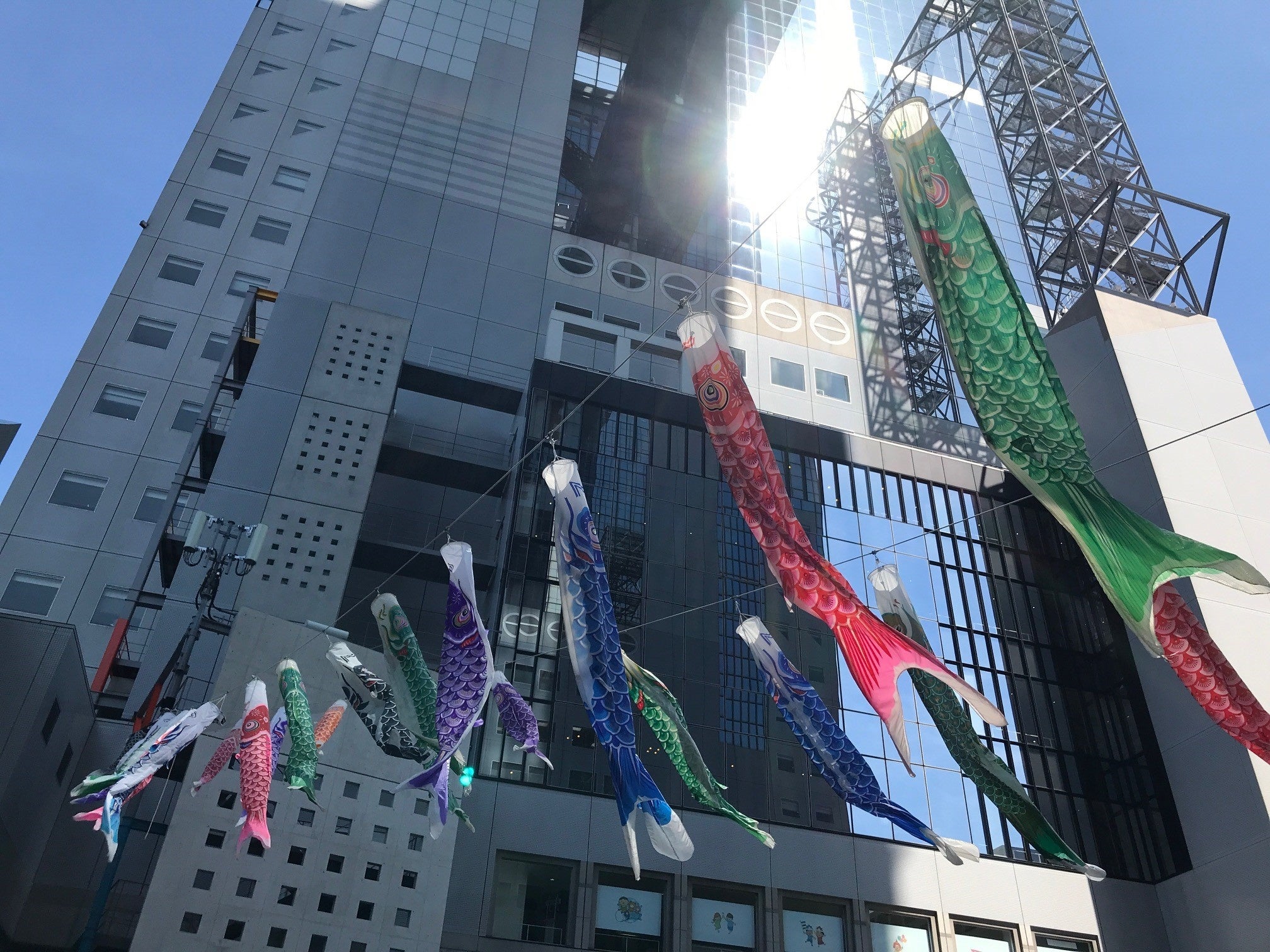 梅田スカイビルの谷間を泳ぐ鯉のぼり