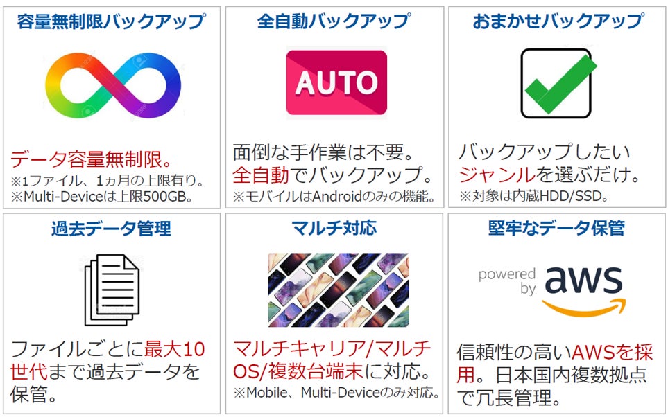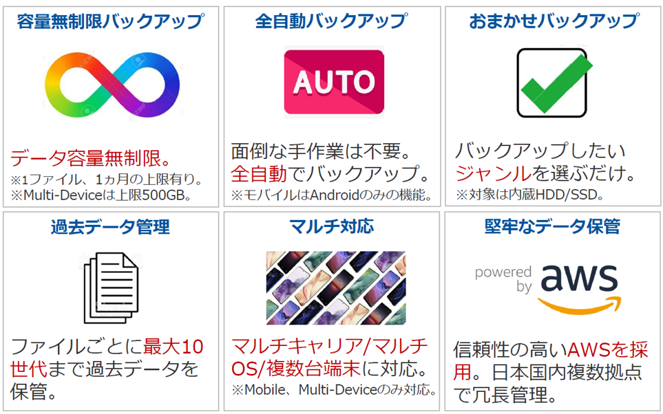―ライフスタイルにあったバックアップでデータを守る。パソコンやスマートフォンに保存しているファイルを簡単・安全にクラウドにアップロードし、家族や友人と共有出来るマルチプラットフォームなクラウドバックアップサービスです。非同期型バックアップサービスのため、パソコンやスマートフォン内のデータを削除してもクラウドには残り、OSやキャリアに依存せず利用可能で、世界中のどこからでもオンラインでアクセスできます。