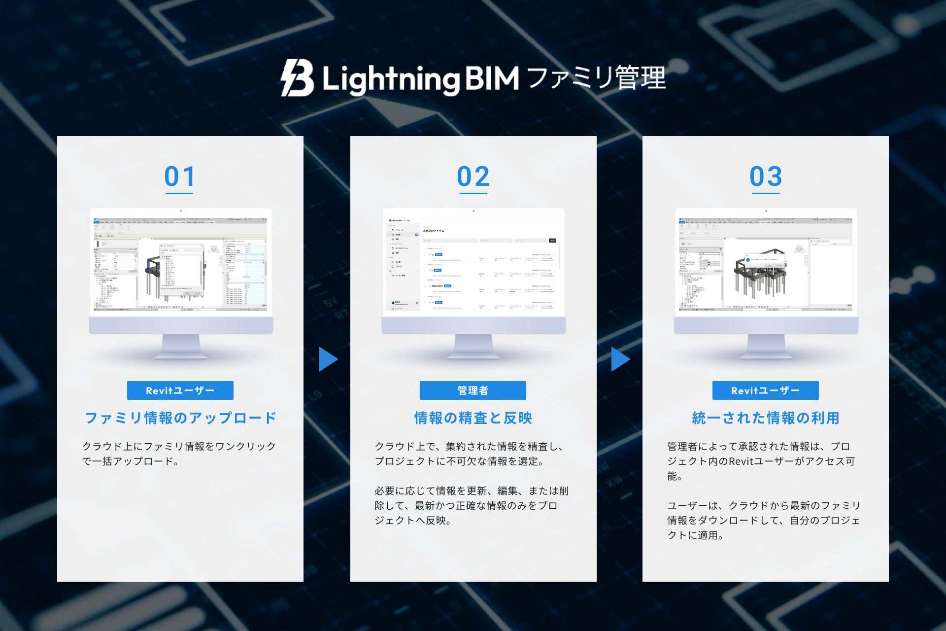 Revitにおけるデータの構成要素「ファミリ」は、様々な属性情報(例:品番、サイズ、金額等)を持ちますが、建設業界ではその標準化に課題がありました。『Lightning BIM ファミリ管理』により、クラウド上でファミリデータを一括管理し、更新を即時にプロジェクトに適用。これにより、手動修正やバージョン確認の必要がなくなり、業務の効率化を大幅に推進します。