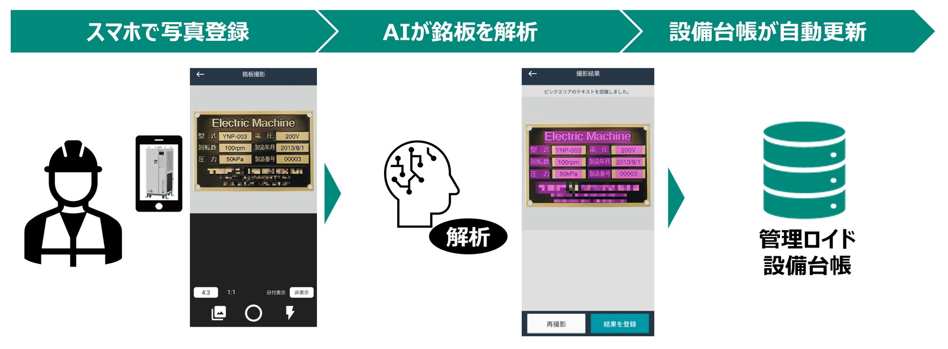 本機能は建物の設備に取り付けられている機械銘板(※1)をスマートフォンのカメラで撮影するだけで、AIが設備機器の詳細情報を読み込み、設備台帳を登録/更新する機能です。