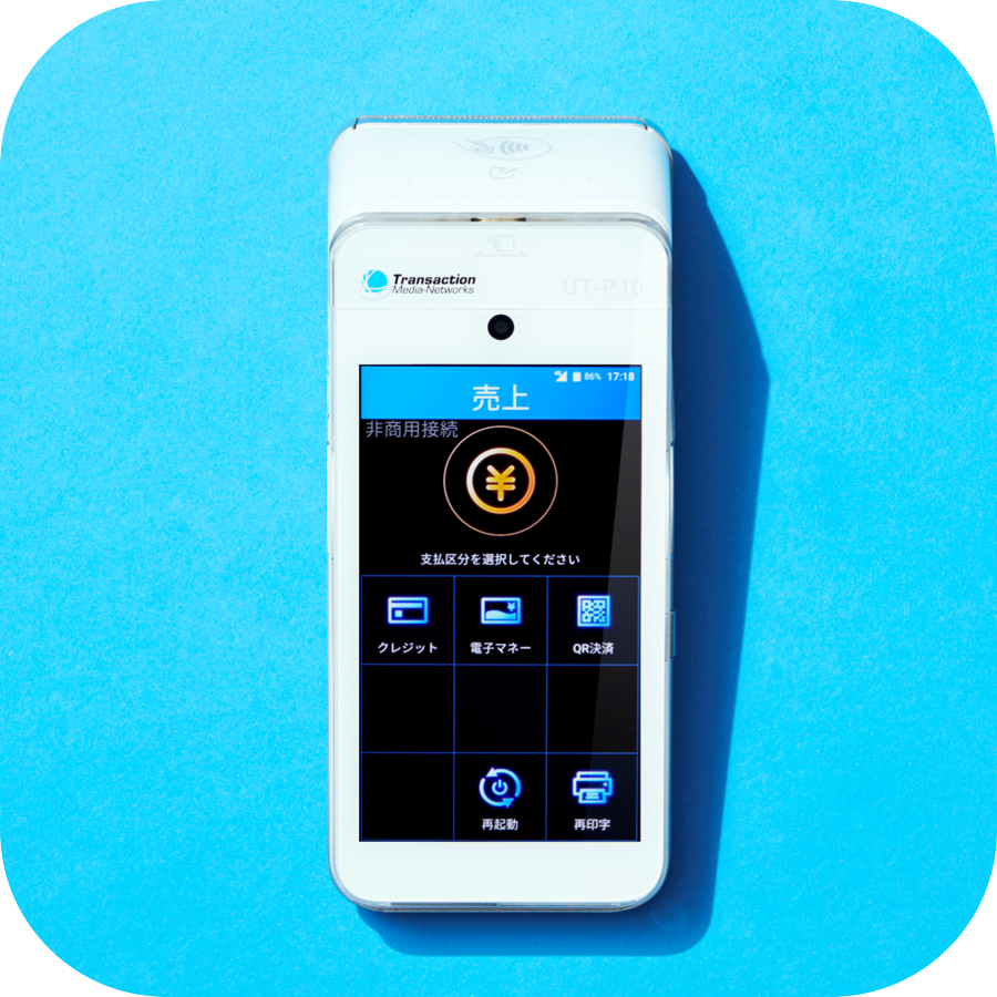 TMNの決済端末「UT-P10」はレシートプリンタが一体となったモバイル型決済端末です。1台で複数の決済に対応できるほか、Android™ベースのため、利用環境に応じたカスタマイズがしやすいことも特徴となっています。本件で導入する「UT-P10」には、車内販売向け専用POSアプリがインストールされており、POSアプリから「UT-P10」に標準装備されているカメラで商品バーコードを読取ることも可能です。