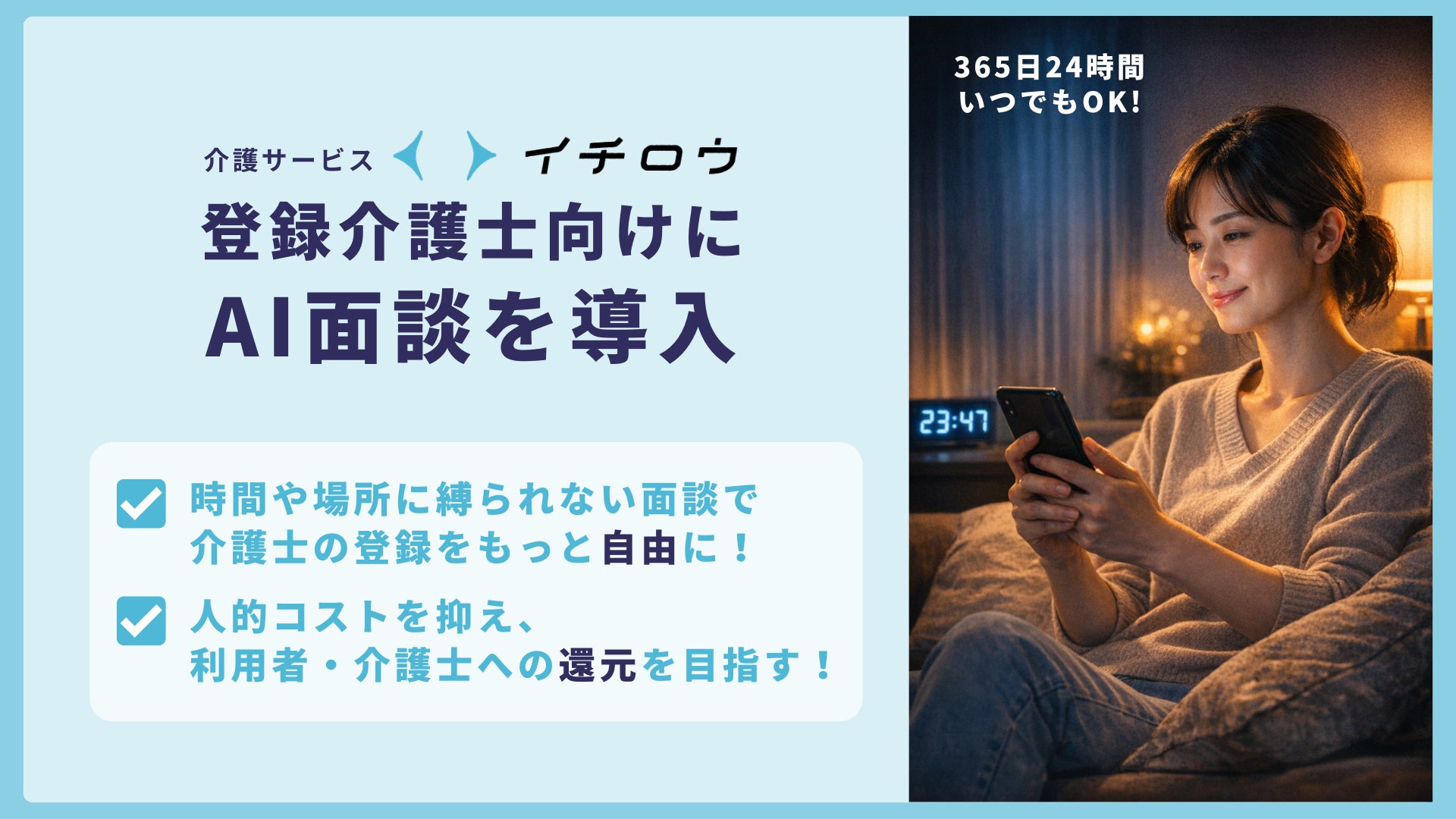 本日より、イチロウ株式会社(本社:東京都渋谷区、代表取締役:水野友喜)は、介護保険外のオーダーメイド介護サービス「イチロウ」に登録する介護士向けに、AI面談を導入しました。イチロウではこれまで、利用者と介護士の相性や価値観を大切にするため、介護士が登録する際には、担当者による対人面談を必ず実施してきました。一方で、登録希望者の増加に伴い、面談の予約が取りづらくなるなど、日中に時間を確保できない介護士の方が面談を受けられず、応募を断念してしまうケースも生まれていました。AI面談の導入によって、こうした課題を解消し、介護士が自身の都合に合わせて面談を受けられる環境を整えるとともに、面談にかかっていた人的コストを抑えることで、今後は利用者と介護士双方への還元を目指していきます。