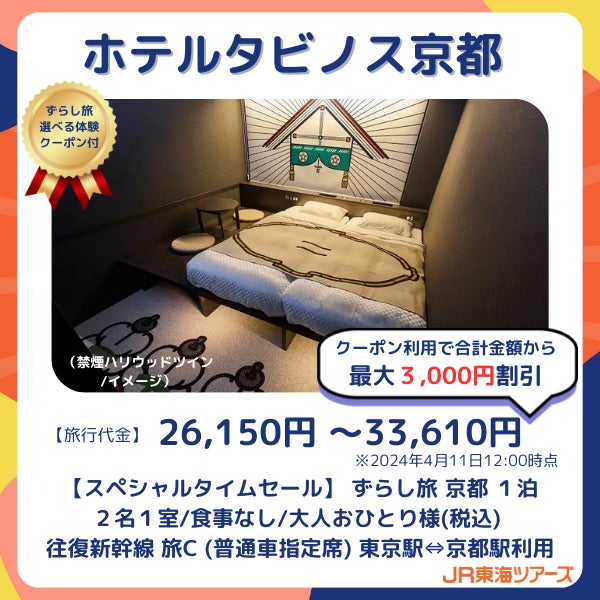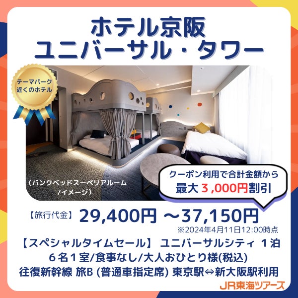 株式会社ジェイアール東海ツアーズ(本社:東京都中央区、以下JR東海ツアーズ)では、2024年4月11日(木)から往復新幹線+宿泊がお得な「スペシャルタイムセール」を、期間限定で実施します。旅先で利用できる選べる体験クーポンが付く「ずらし旅」に加え、テーマパーク付近のホテルが選べるツアーも登場し、この期間ならではのスペシャル価格でご案内します。EX会員情報にLINEアカウント連携をすると、セール価格からさらに最大3,000円割引になる各種割引クーポンをご用意。旅行中でも列車変更が可能で、さらに1か月以上先の旅行でも宿泊予約と同時に新幹線が確約となる、便利で安心な「EX旅パック」のお得なセールをお見逃しなく。(※往復新幹線代金は、 のぞみ号 普通車指定席 通常期の運賃・料金です。)