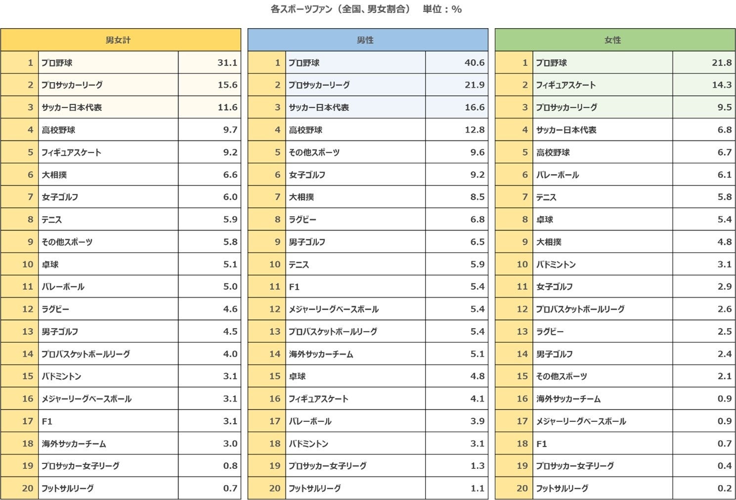 各スポーツ別ファン率の調査を行った結果、男女計、また男女それぞれを見ても2位に約2倍の比率をつけて1位を獲得したのが、プロ野球でした。男女計、男性ともに2位はプロサッカーリーグ、3位はサッカー日本代表という結果に。女性2位はフィギュアスケート、3位はプロサッカーリーグという結果になりました。