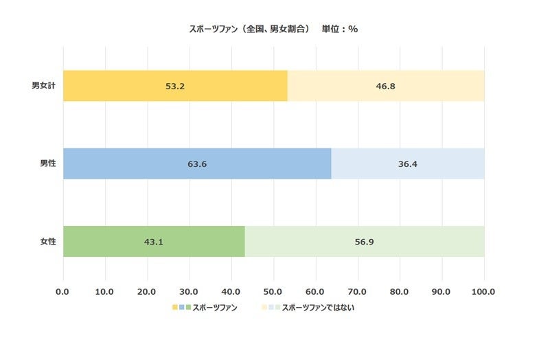 スポーツファンは全体で53.2%。男性が63.6%、女性が43.1%
