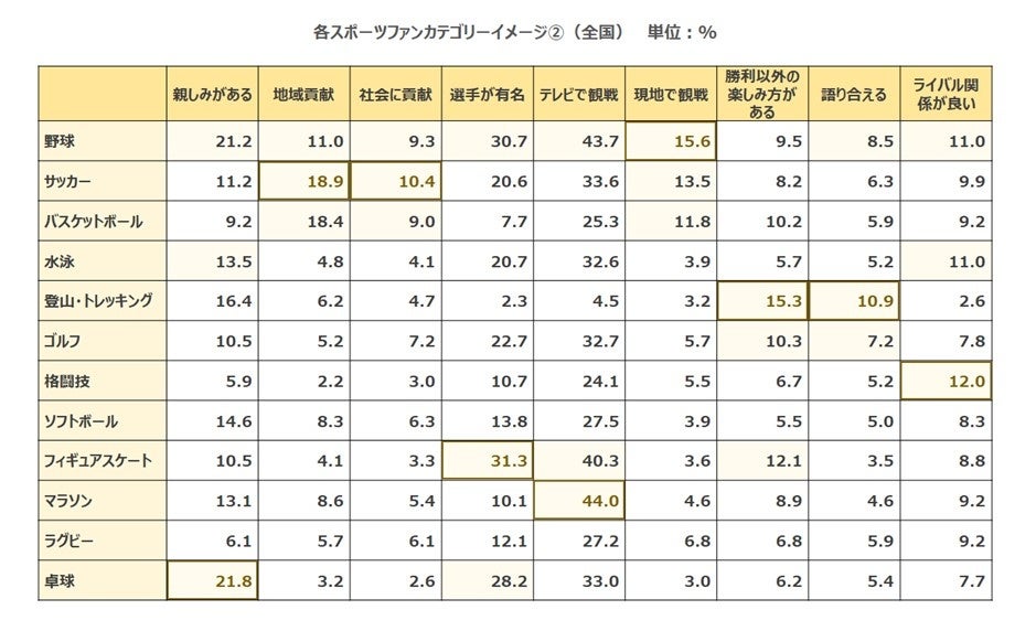 さらに「親しみがある「地域・社会貢献」「観戦」等といったカテゴリーイメージを総合的に見ると、圧倒的に野球の比率が高いことがわかりました。また、「地域貢献」「社会貢献」ともに1位の比率をサッカーが占めており、プロサッカーリーグが地域密着で運営していることが認識されていると伺えます。