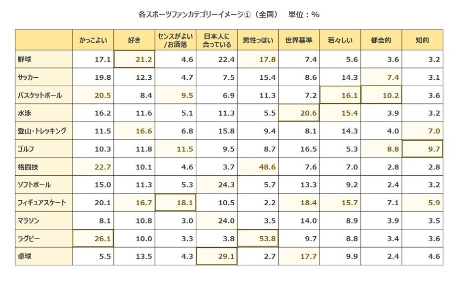 各スポーツのイメージ調査を実施した結果、「かっこよい」1位はラグビーでした。また、「センスがよい/お洒落」などを筆頭に、「好き」「世界基準」「若々しい」「知的」と総合的にフィギアスケートが好印象という結果となりました。