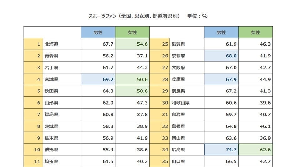 スポーツファンが多い都道府県は? 男女ともに1位は広島県、男性2位宮城県、女性2位北海道
