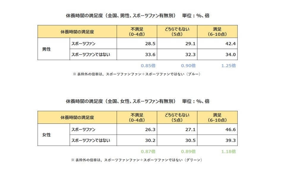スポーツファンの休養時間満足度は、ファン以外の方の1.25倍